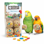 Każda piłka została wypełniona ziarnami słonecznika ukrytymi w wiklinowej konstrukcji. Papuga musi pracować dziobem i łapką, aby dostać się do środka. To aktywizuje, zajmuje uwagę i wspiera naturalne zachowania żerowania.