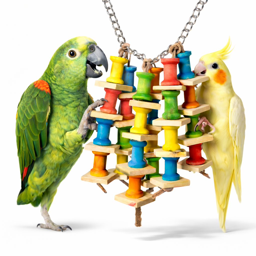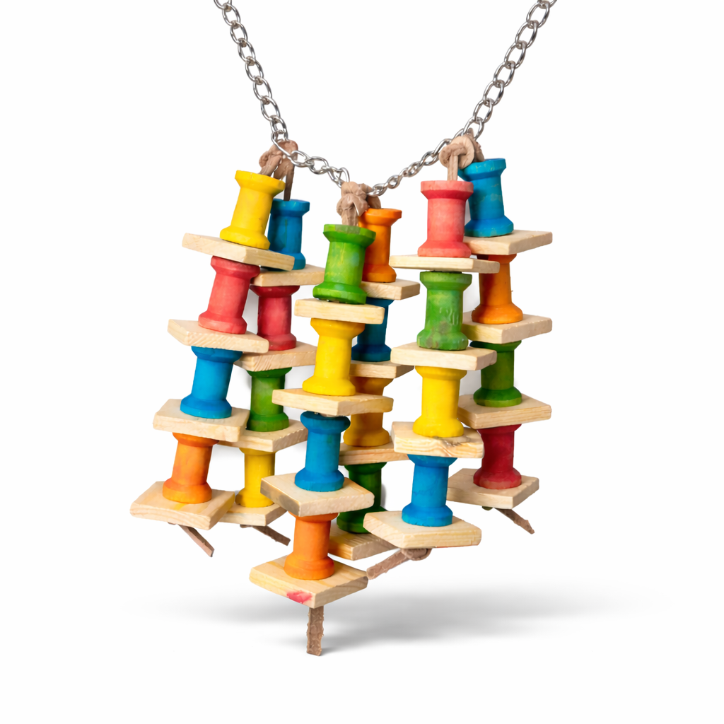 Wiszące Drewienka to uniwersalna zabawka, która aktywizuje papugę poprzez żucie, wspinanie i manipulowanie elementami. Różnorodne kawałki drewna zachęcają do pracy dziobem i łapkami, co pomaga ograniczyć nudę oraz destrukcyjne zachowania.
