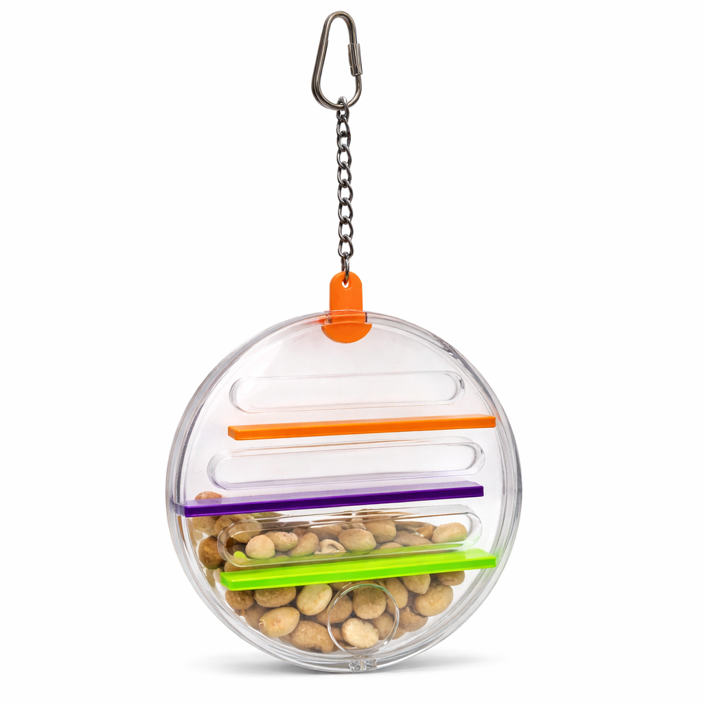 Do wnętrza możesz włożyć świeże warzywa, owoce, granulaty lub ulubione przysmaki. Papuga kręci kołem, manipuluje nim dziobem i łapkami, a przy okazji ćwiczy koncentrację, koordynację i zręczność. To świetne rozwiązanie dla ptaków, które szybko się nudzą i potrzebują dodatkowej stymulacji.
