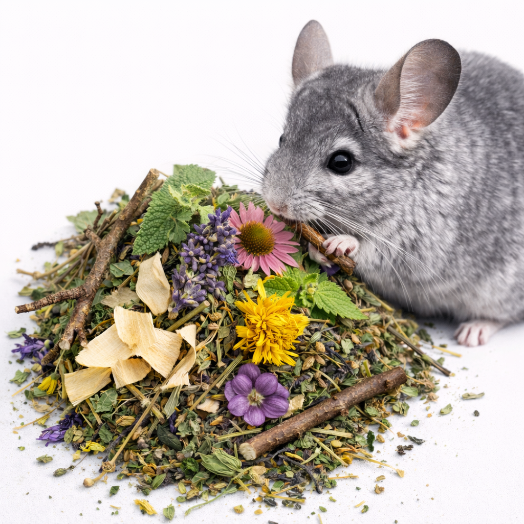 Ziółka i Gałązki dla Szynszyli i Koszatniczek to starannie skomponowana mieszanka roślinna dostosowana do potrzeb tych wrażliwych gryzoni. Zawiera zioła, liście oraz gałązki, które wspierają naturalne żerowanie i podgryzanie.