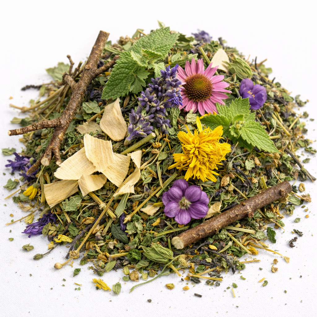 gałązki gruszy, pokrzywa, lucerna, topinambur (ziele), jeżówka, mniszek, łodyga porzeczki, liść truskawki, chipsy brzozowe, nagietek, lawenda, ślaz