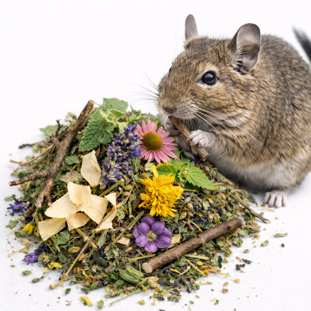 Ziółka i Gałązki dla Szynszyli i Koszatniczek to starannie skomponowana mieszanka roślinna dostosowana do potrzeb tych wrażliwych gryzoni. Zawiera zioła, liście oraz gałązki, które wspierają naturalne żerowanie i podgryzanie.