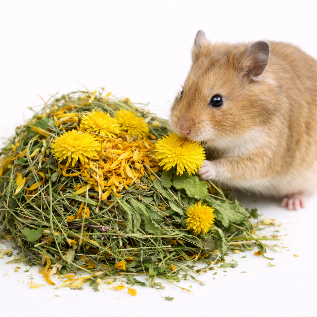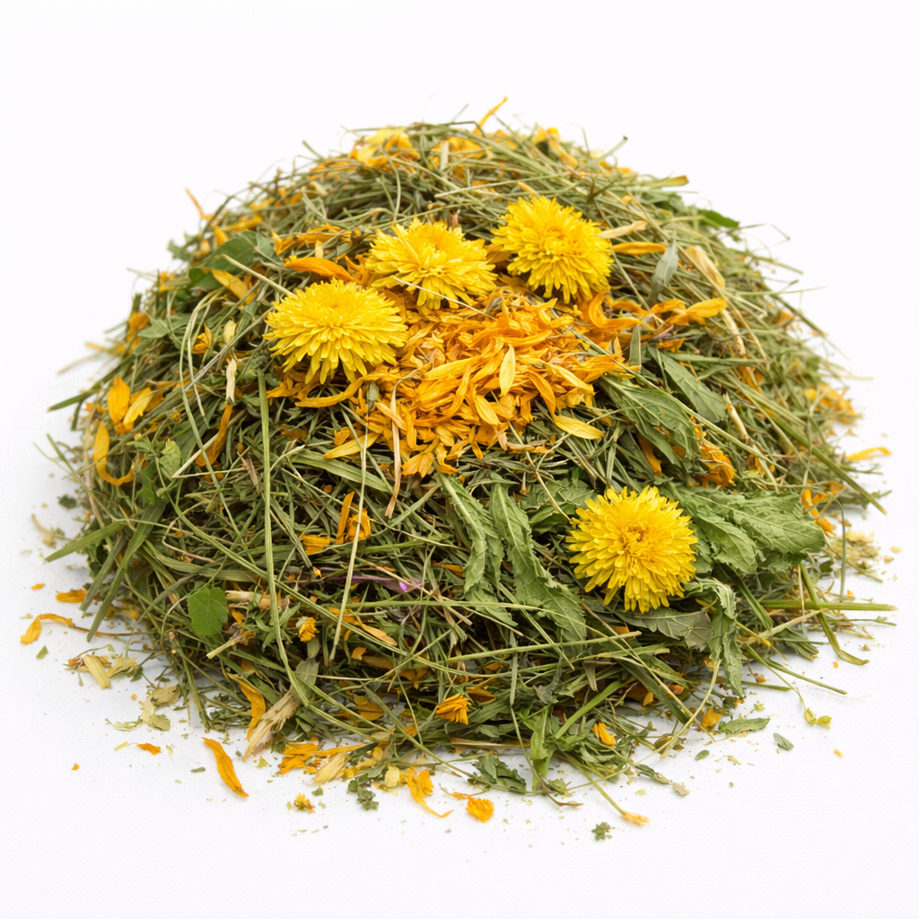 Wysoka zawartość mniszka lekarskiego (22%) sprawia, że mieszanka jest chętnie pobierana przez gryzonie. Dodatek nagietka (15%) wzbogaca skład o intensywny kolor i aromat, a lawenda nadaje delikatną nutę zapachową.