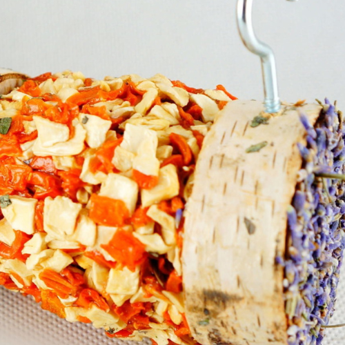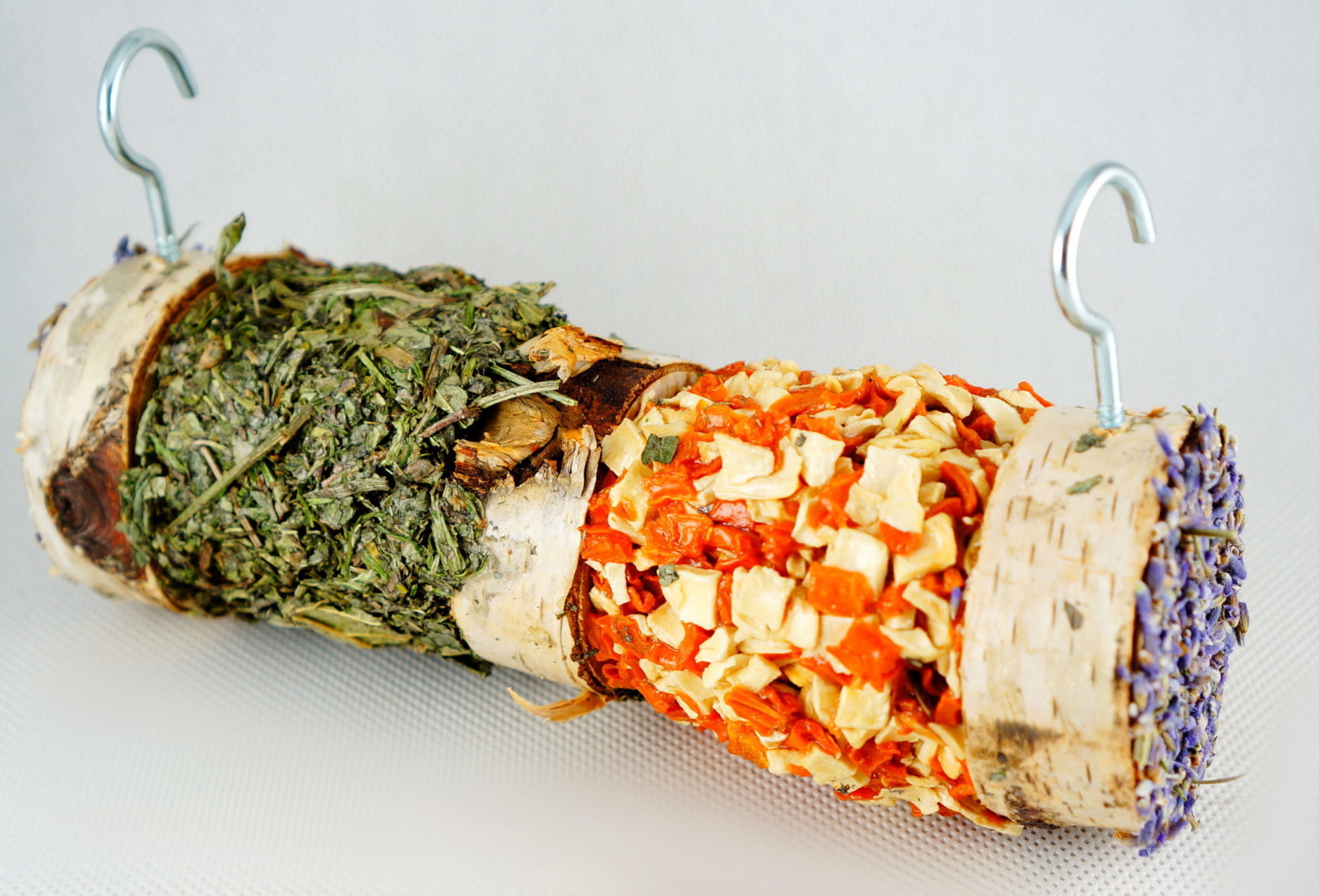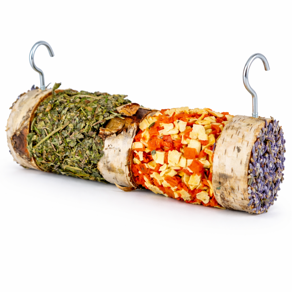 Forma szaszłyka umożliwia łatwe zawieszenie w klatce, co pomaga wzbogacić środowisko bytowe gryzoni i zapobiega nudzie.
